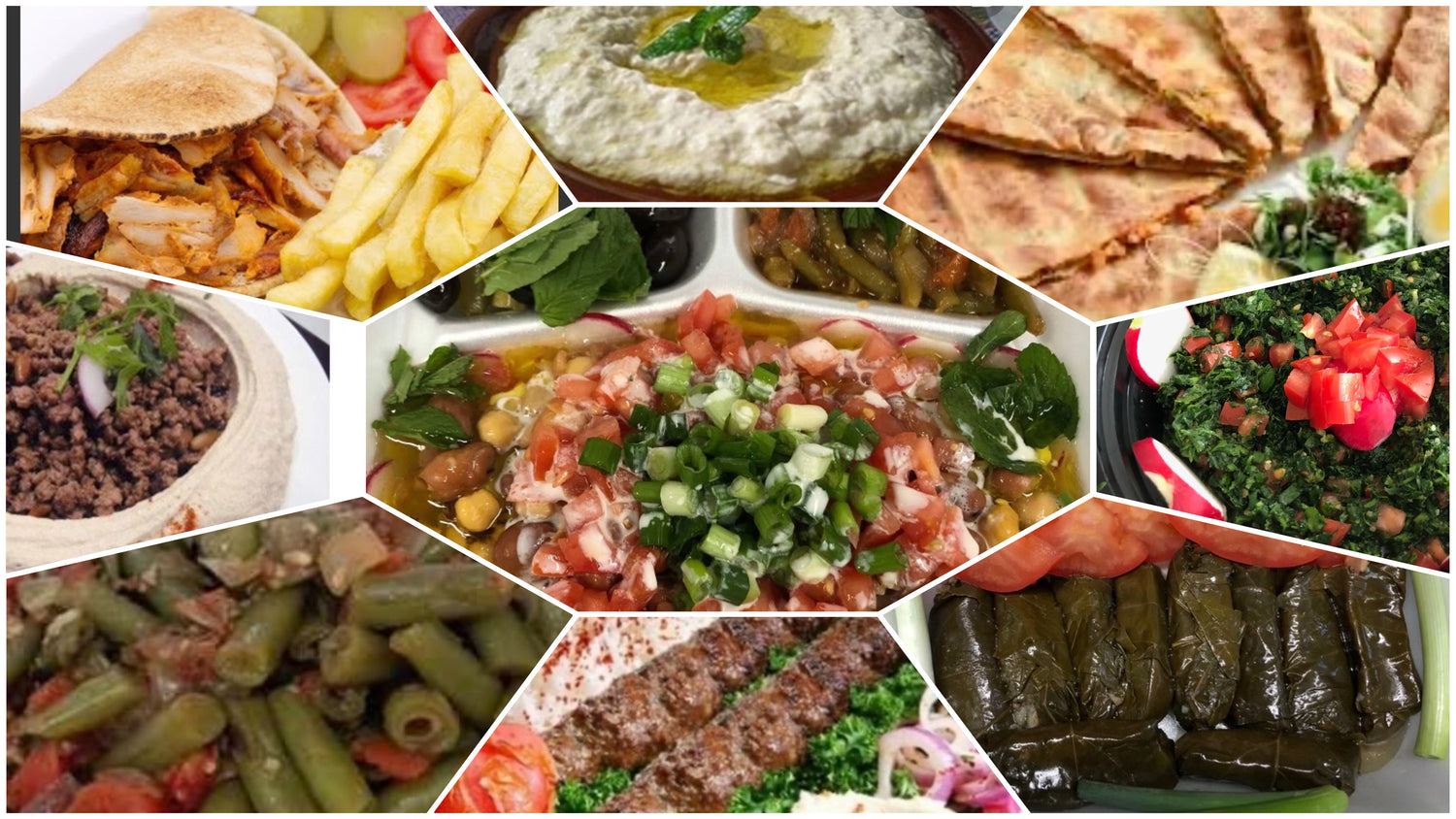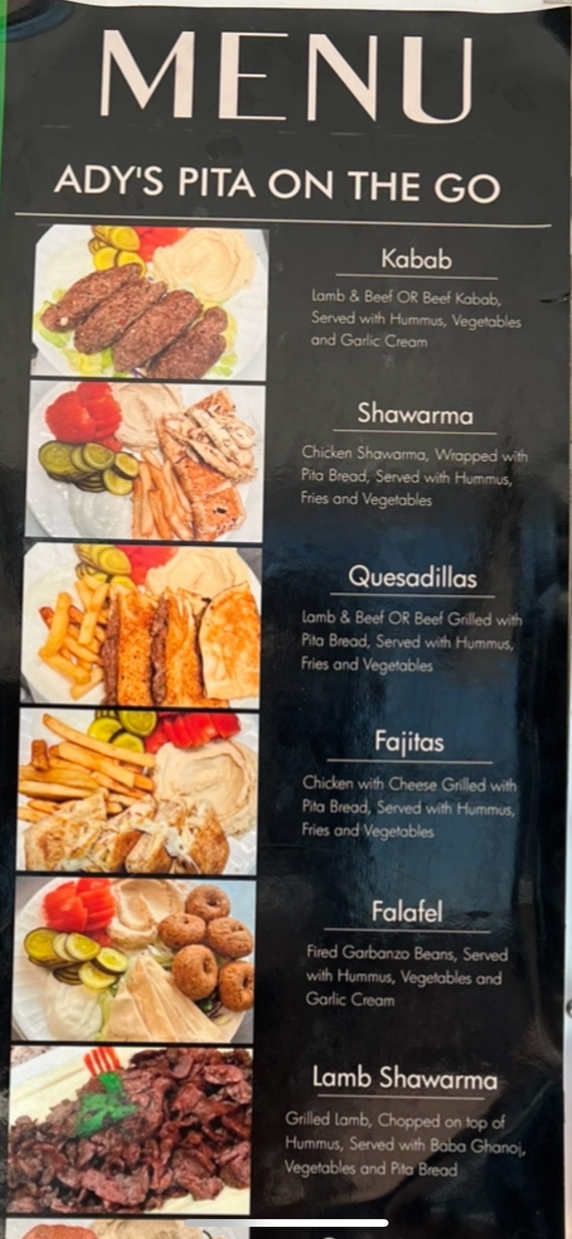 Kabob, Chicken Shawarma, Quesadillas, Fajitas, Falafel, Lamb Shawarma with Hummus.